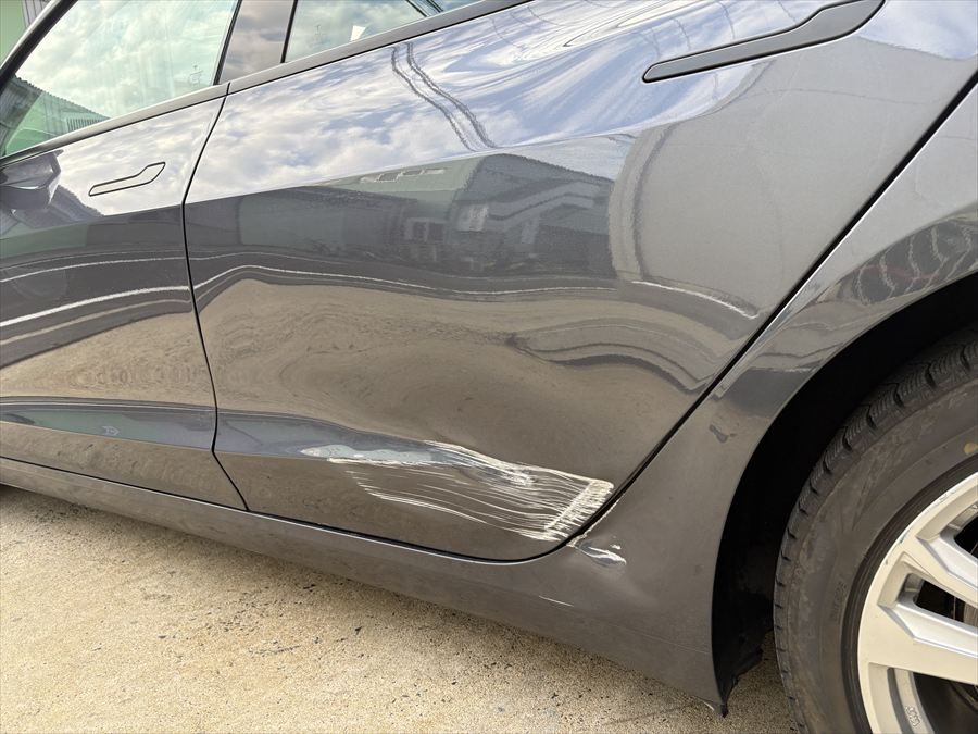 🚙テスラ モデル3 左のリアドア交換塗装、リアフェンダー鈑金塗装